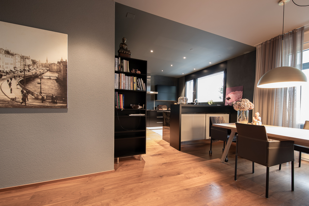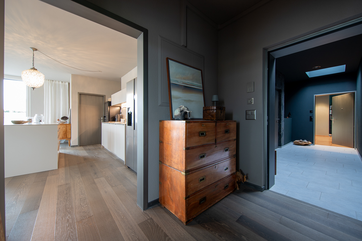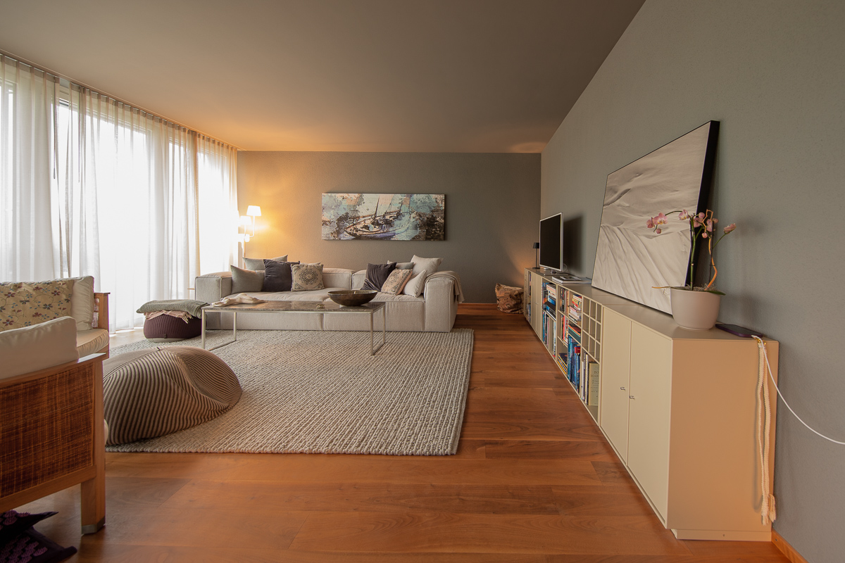 Im Mehrzweckraum entstand ein grosszügiger, multifunktionaler Wohnraum, den wir in hellen Farbtönen gestaltet haben – abgestimmt auf das neu verlegte Parkett von Markus Schweizer sowie die neu erstellte Küche von Sibylle Frei. Ebenso wurden die Sockelleisten mittels traditioneller Handwerkstechnik des Maserierens farblich in Platinoptik angepasst. Abgerundet wird das Gesamtbild durch farblich abgestimmte, lackierte Elektroabdeckungen.