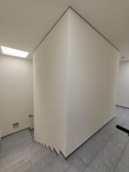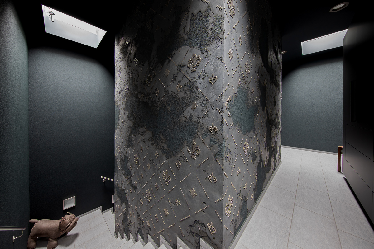 Das bestehende, kühl wirkende Treppenhaus soll nun im Mittelpunkt stehen, wobei der Kubus in edler Antikverputztechnik von dunklen Farbtönen umhüllt, wirkungsvoll in Szene gesetzt wird. Abgerundet wird das Konzept durch kontrastreiche Türen und Zargen in gebürsteter Platinoptik.
