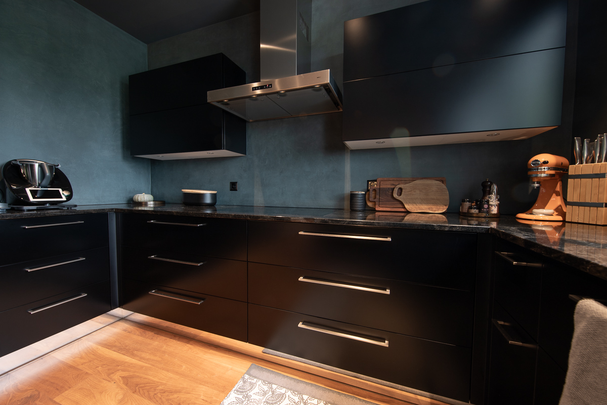 Die Nischenküche im Wohnraum hat uns inspiriert, daraus eine „Cocoon"-Kochoase entstehen zu lassen. Die bestehende, intakte Küche wurde von unserem Partner Vincent Mertz in hochwertiger Autolackqualität mattschwarz lackiert, umhüllt von petrolblauem Terra di Pietra sowie einer im selben Farbton gestrichenen Decke. Wohnraum und Korridor runden das Konzept mit einem Anstrich im passenden, mittleren Grauton harmonisch ab.