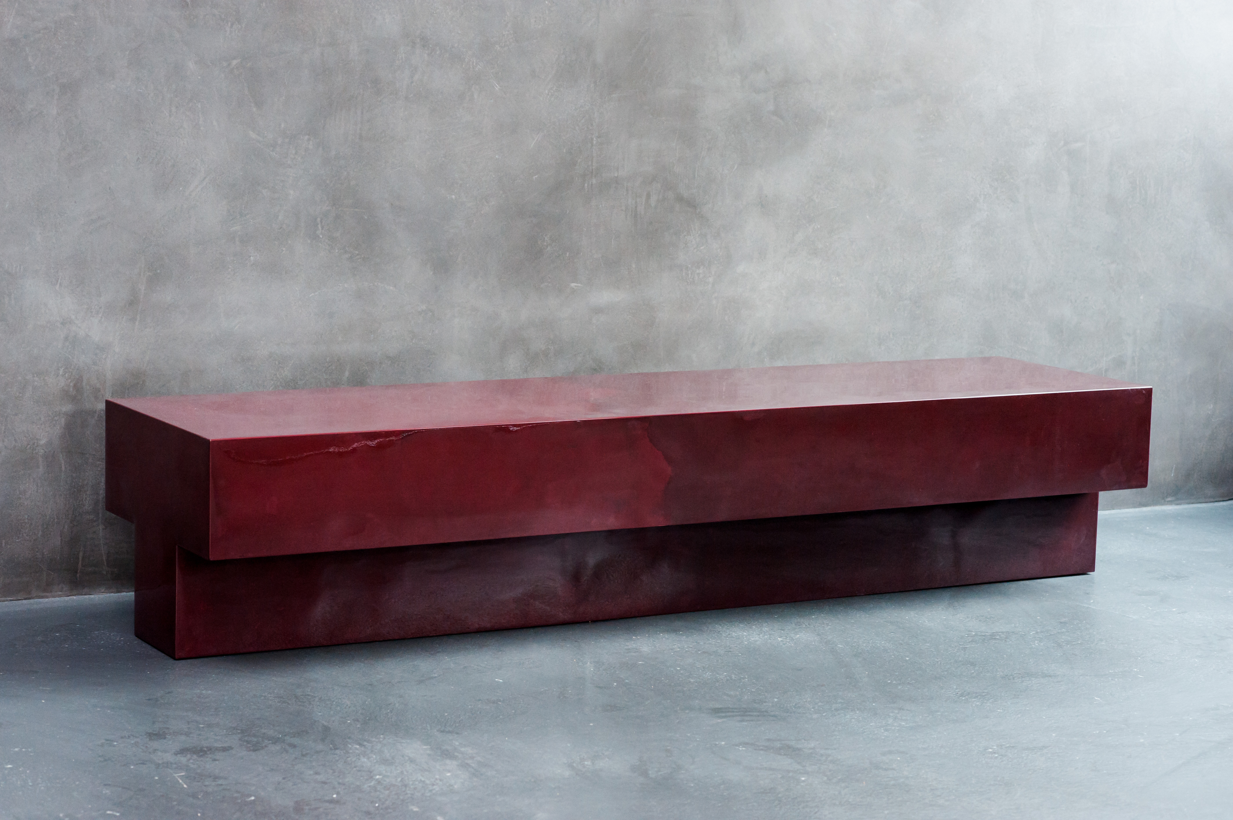 Gewünscht war ein von Hand gefertigtes Lowboard für eine private Lounge. Jacqueline van Maren, projektbegleitende Innenarchitektin, entwarf ein exklusives T-förmiges Element, das sich mit seiner einzigartigen, glänzenden Oberfläche in Bordeauxrot harmonisch in die Lounge einfügt und das Raumkonzept abrundet.